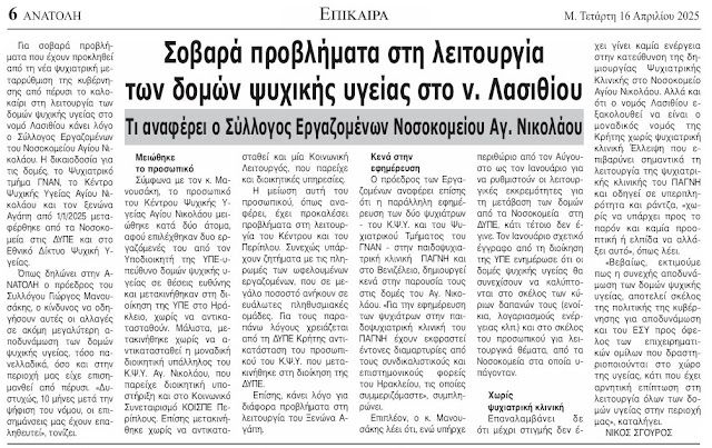 Σοβαρά προβλήματα στη λειτουργία των δομών ψυχικής υγείας στο ν. Λασιθίου – δημοσίευμα στο σημερινό φύλο της εφημερίδας ΑΝΑΤΟΛΗ